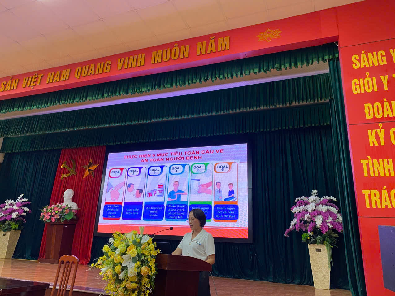 Tại buổi tập huấn, Th.S Nguyễn Thị Oanh - Trưởng phòng QLCL&CTXH đã triển khai các giải pháp đảm bảo an toàn người bệnh tập trung vào việc củng cố kiến thức, thực hành đúng quy trình chuyên môn, nâng cáo văn hóa an toàn, không đổ lỗi; các mục tiêu toàn cầu đảm bảo an toàn người bệnh bao gồm: Nhận diện đúng người bệnh; nâng cao hiệu quả trao đổi thông tin giữa nhân viên y tế và người bệnh; đảm bảo an toàn sử dụng thuốc (đặc biệt nhấn mạnh tuân thủ 5 đúng trong sử dụng thuốc); đảm bảo an toàn phẫu thuật; giảm nguy cơ nhiễm khuẩn bệnh viện, giảm nguy cơ té ngã cho người bệnh. Trong đó nhấn mạnh cần sự chung tay góp sức của toàn bộ nhân viên y tế tạo môi trường an toàn cho người bệnh khi đến khám chữa bệnh tại bệnh viện.