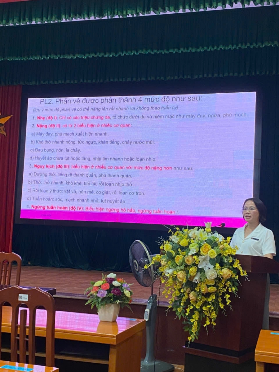Bên cạnh các nội dung chung, lớp tập huấn cũng đặc biệt chú trọng cập nhật kiến thức về phòng ngừa và xử trí sốc phản vệ theo Thông tư 51/2017/TT-BYT của Bộ Y tế. Các học viên được hướng dẫn nhận biết sớm dấu hiệu sốc phản vệ, phân loại mức độ, quy trình xử trí cấp cứu kịp thời, cũng như thực hành sử dụng thuốc và trang thiết bị cần thiết, đặc biệt là Adrenalin trong cấp cứu. Nội dung này giúp nâng cao năng lực phản ứng nhanh, đảm bảo xử trí đúng phác đồ, góp phần giảm thiểu nguy cơ và bảo vệ an toàn tính mạng cho người bệnh.