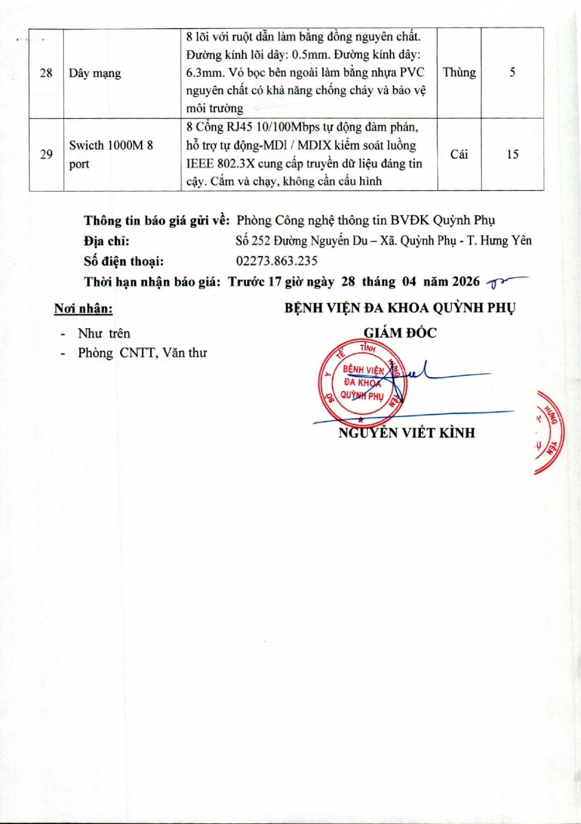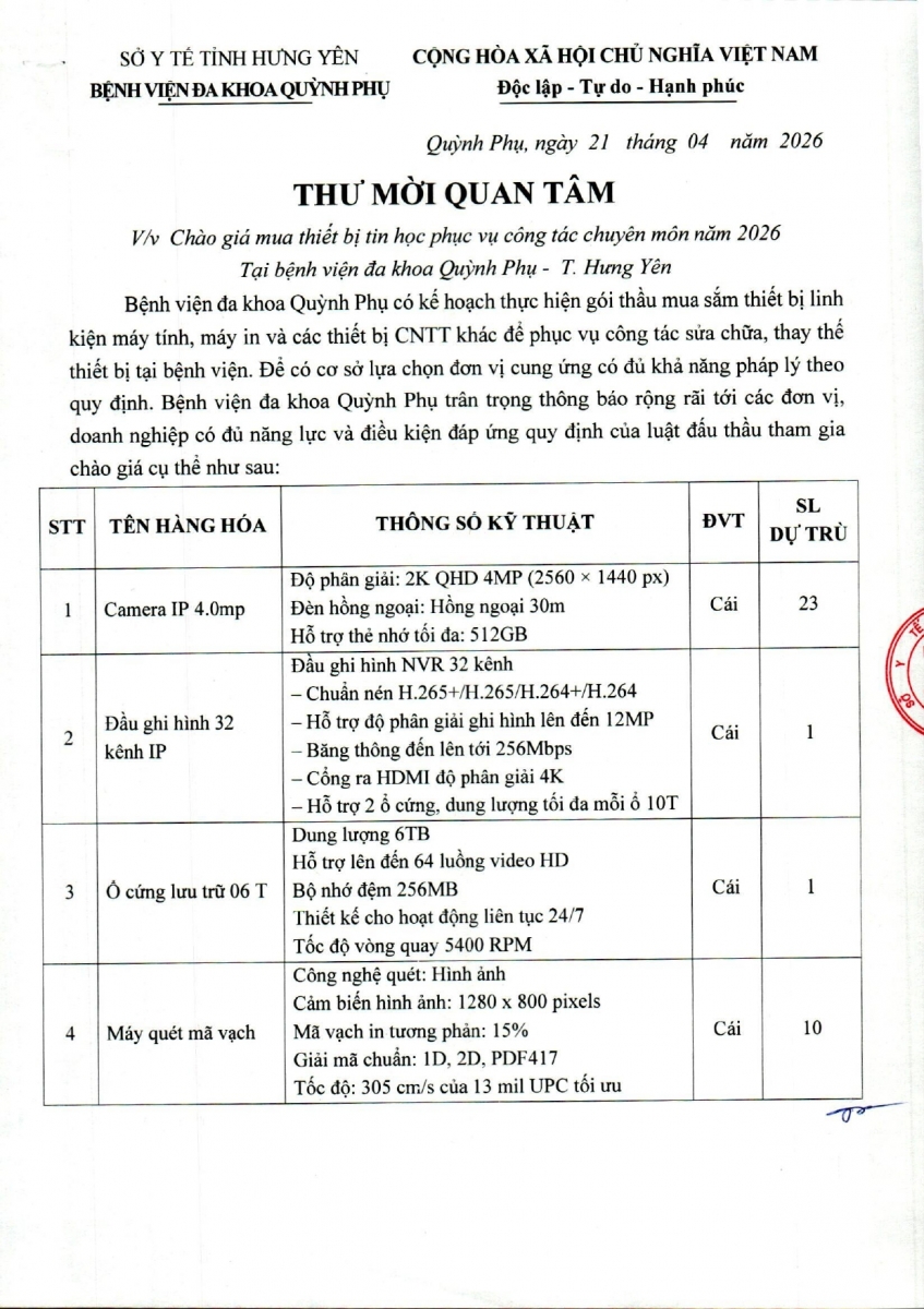 • BỆNH VIỆN ĐA KHOA QUỲNH PHỤ THÔNG BÁO YÊU CẦU BÁO GIÁ ĐỂ THAM KHẢO XÂY DỰNG DỰ TOÁN MUA SẮM, LÀM CƠ SỞ TỔ CHỨC LỰA CHỌN NHÀ THẦU CHO GÓI THẦU:" MUA SẮM VĂN PHÒNG PHẨM NĂM 2026 BỆNH VIỆN ĐA KHOA Q