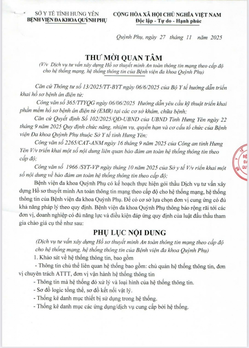 • THƯ MỜI BÁO GÁ GÓI THẦU MUA SĂM MÁY TÍNH, MÁY IN PHỤC VỤ CÔNG TÁC CHUYÊN MÔN TẠI BỆHNH VIỆN ĐA KHOA QUỲNH PHỤ NĂM 2025